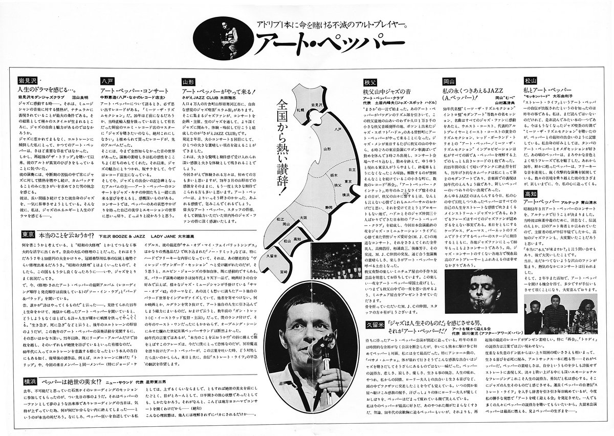 ART PEPPER IN JAPAN If it hadn’t been for the overwhelming enthusiasm of the Japanese jazz fans for his music, I wonder if Art would have been able to continue recording and writing as much as he did at the end of his life. I wonder if he would have cared to try––lacking the encouragement they lavished on him whenever we toured there. You can hear the gratitude in Art’s voice when he speaks to this crowd. More than most people, Art required not just appreciation; he required love, and these audiences let him know they loved him. They sustained him emotionally and their purchases of concert tickets and albums paid our bills. I have a huge stash of stuff recorded on our last Japanese tour in November of 1981––when we were able to keep the same excellent sound technician with us for all the stops on our tour. He recorded every concert from the sound board, so the quality is very good, and this year the able Rocco digitized them all. I’ve just begun listening to them. They were fabulous concerts, maybe the best yet. If I have enough life and money left, I plan to give them back to all Art’s fans––and repay their love with beauty.