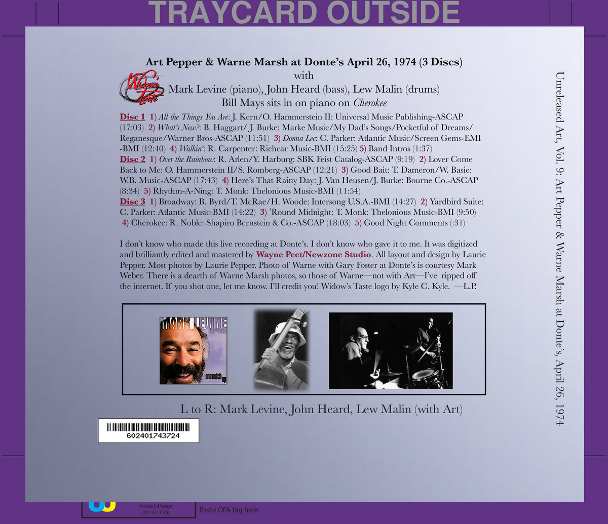 Though Warne forbade recording at his gigs, this gig was recorded. On reel-to-reel, quarter inch, quarter-track tape. The original tapes were quite good; the audio was probably picked up from the sound board. And the tapes were sent to Laurie Pepper by persons never known or now forgotten. She rediscovered them while cleaning out a closet. As she tells us in her liner note: 'Sometimes, the way things and people come to me for Art's sake is, I want to use the word, miraculous A good word for this night and those tapes. Laurie gave them to the incomparable Wayne Peet of Newzone Studio, who, "knows how jazz, how Art should sound." He balanced and enriched the onstage sound, killed excessive noise, and dealt delicately with inevitable glitches that occur in live recording. Laurie, a non-musician, goes on to talk about the Pepper/Warne distinctions in the language of a dedicated fan.