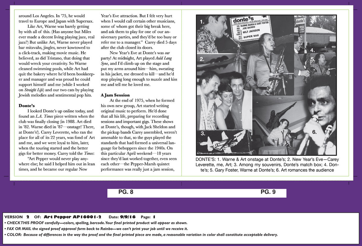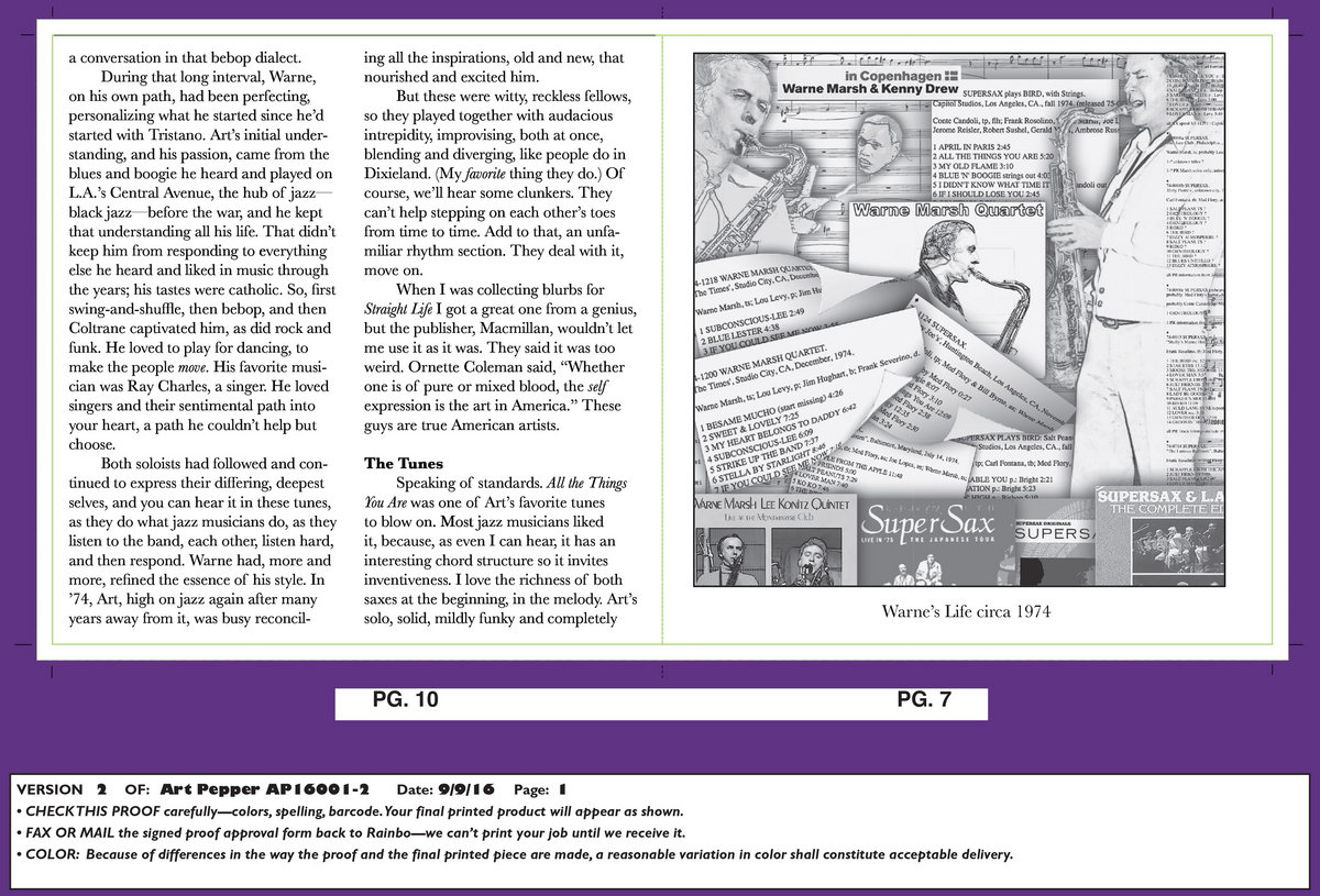 Liner Note: On April 26, 1974, two wildly gifted and very different artists, Art Pepper and Warne Marsh, met again, for the first time in 17 years, by accident, on the stage at Donte’s in North Hollywood, because Jack Sheldon had to cancel. It must have made for an unforgettable night for those who found themselves sitting in the legendary club and listening to two cult heroes, two profoundly great musicians, playing for the audience and each other—out of the lives they’d lived at the same time, in the same places, but personally and stylistically so far apart.